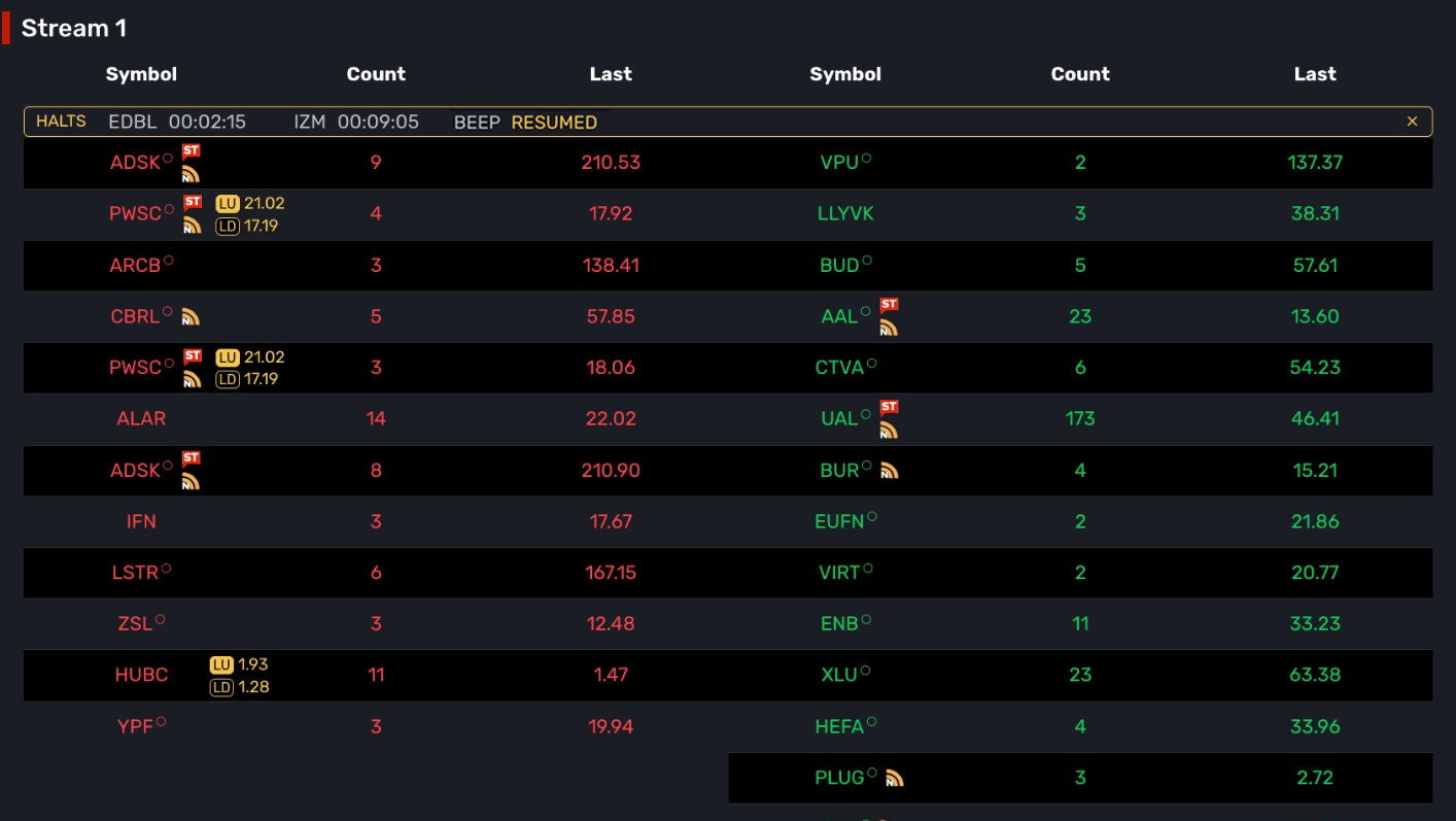 May 1st, 2024 update: We've recently enhanced our HOD/LOD to include limit up/limit down (LULD) values as well as a realtime halt bar. This includes the ability to see active halts and the duration as well as their resumption (note image below).