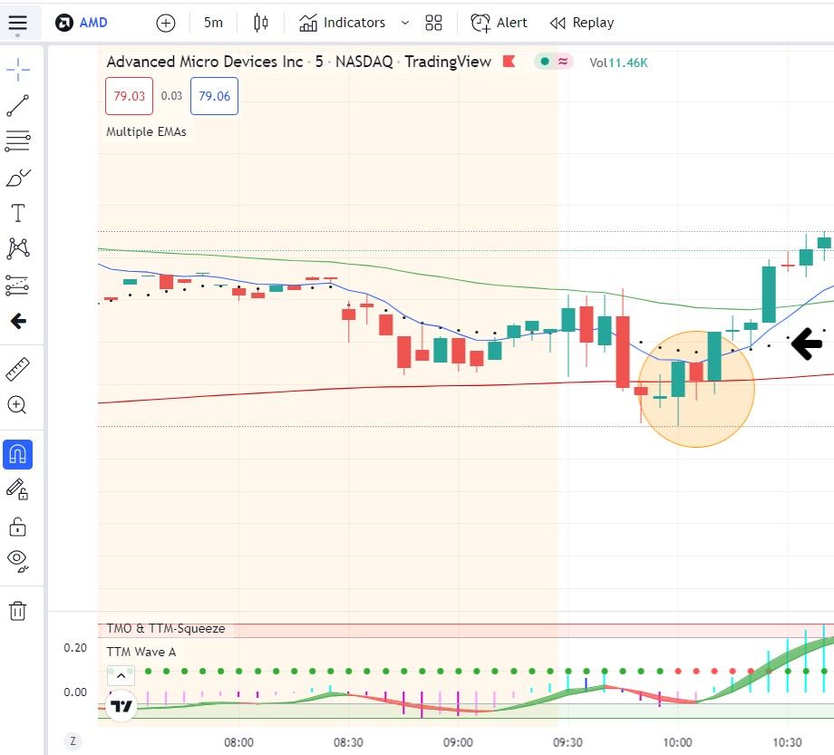 I checked the 5 min chart with my broker and could see that AMD had just had a bounce off the 200ema and cleared VWAP, bouncing off of it in the next candle.