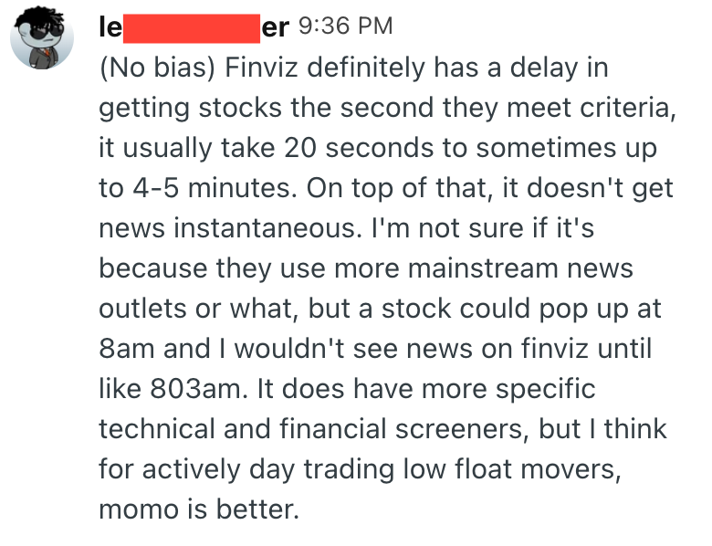 (No bias) Finviz definitely has a delay in getting stocks the second they meet criteria, it usually take 20 seconds to sometimes up to 4-5 minutes. On top of that, it doesn't get news instantaneous. I'm not sure if it's because they use more mainstream news outlets or what, but a stock could pop up at 8am and I wouldn't see news on finviz until like 803am. It does have more specific technical and financial screeners, but I think for actively day trading low float movers, momo is better.