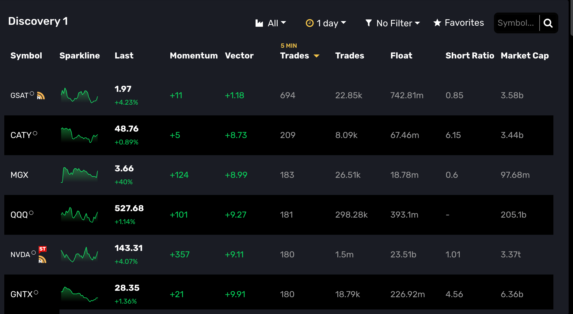 After you select your criteria and time frame, you will see the Time Stacked column in Discovery as shown below (5 min Trades). The significance of this is that you have both 5 min Trades constant regardless of the selected time frame, which in this instance is set for 1 Day.