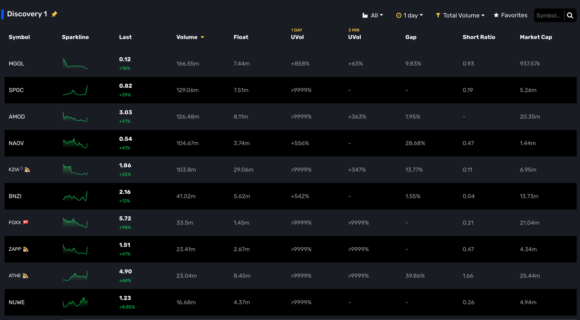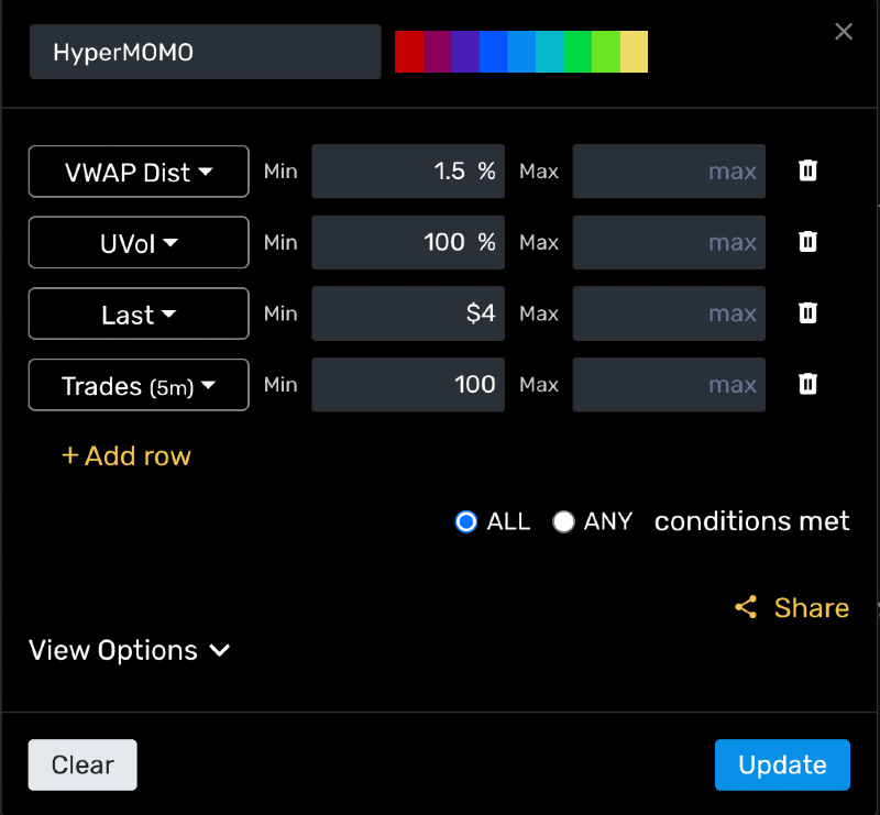 Imagine you want to identify stocks with 300% unusual relative volume on the daily chart, while also tracking stocks with 100% unusual volume in the past 5 minutes. Time Stacking makes this possible. The combinations you can create are nearly limitless, allowing you to tailor your screening to your exact needs.