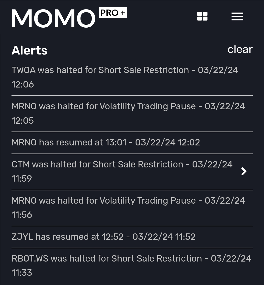 Where in the past you might get a halt notification in 20 seconds or more after the halt, now MOMO Pro is displaying them instantaneously. And while there's a bit of a stall before all trading is fully frozen limiting your ability to get out on this notification, it's still more useful as it's more trustworthy and can save you from getting stuck in a halt.