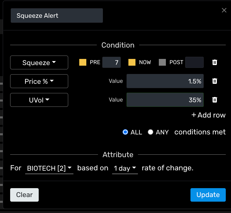 The second example highlights MOMO Squeeze, an indicator exclusive to MOMO Pro+. As you may know, the squeeze indicator orginated as a charting indicator for visualizing periods of contraction and expansion. We repurposed to allow you to define conditions. As shown, we are looking for any result with at least 7 daily periods of consolidator (PRE) or also currently in a breakout (NOW) with at least 1.5% of movement and 35% unusual volume . This assigned to any biotech and 1 other category basing the evaluations on daily numbers