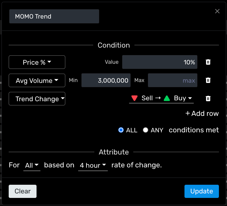 This Conditional Alert is built to highlight MOMO Trend Changes. What this will do is report all stocks which have a 10% gain, having a minimum of 3M avg shares traded with MOMO Trend state switching from a SELL to a BUY based on 4 hour timeframe. This is important because Price% and Trend Change will report differently depending on timeframe. (e.g. 10% daily gain is versus prior day close where 4hr timeframe is based vs. prior 4hr close).