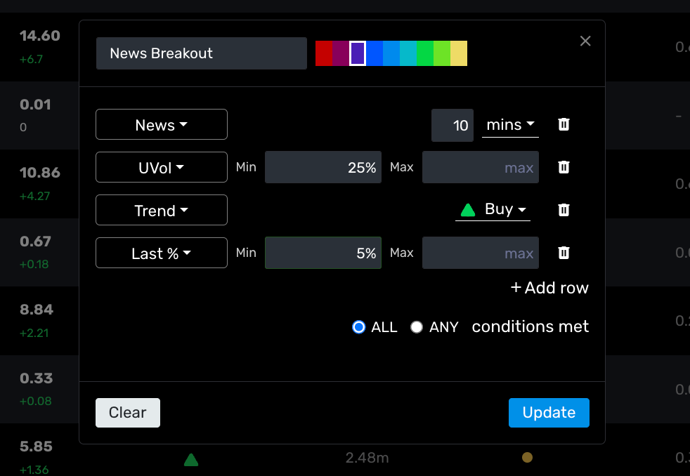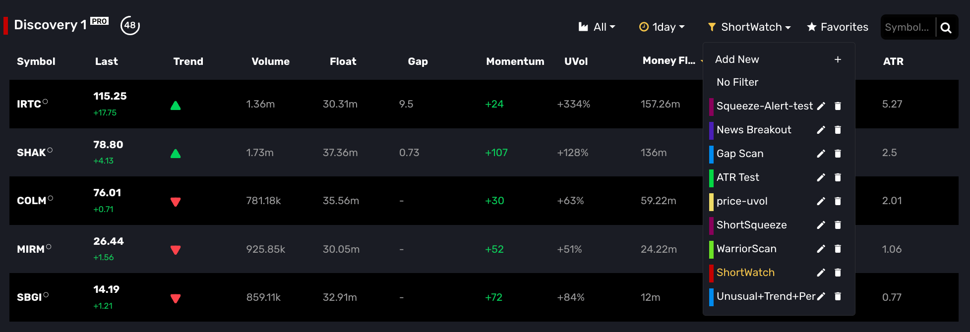 To help manage the dual Discovery and Stream windows we have added the ability to color code the windows with a small reference bar next to the windows. Sure we have a numerical indicator, but the additional color coding can be mapped to the specific active filter. For example, you can label all your "short" filters "red" for quick reference. Or in the case below, Purple for a "News Breakout" filter.