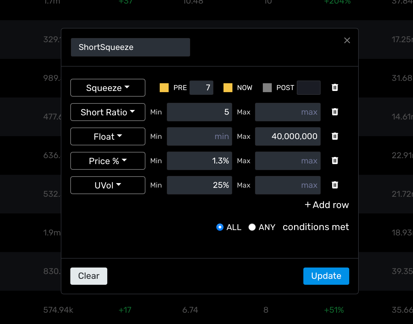 Short ratio can be used during day to day as for informative purposes while using Discovery or you can filter as shown below. To create a Short Squeeze filter as shown above I used the following settings: