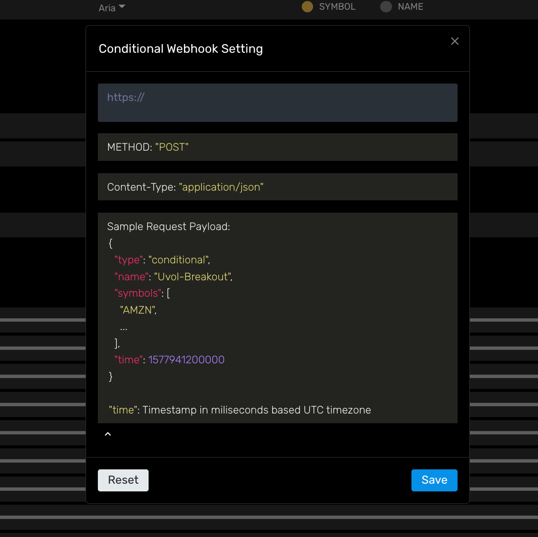 MOMO Pro+ subscribers will see the familiar </> next to supported alert types. When clicked it provides necessary integration details. Webhooks are provided for the following alert types: Halts, Conditional, High/Low, Unusual Vol, VWAPdist%, and Price %.
