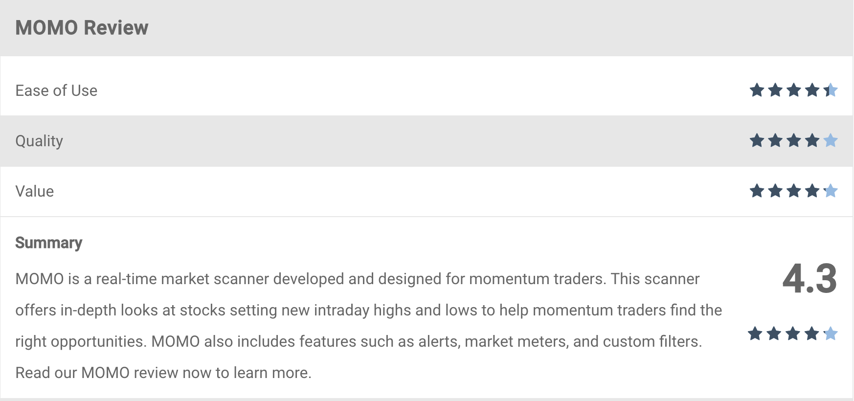 MOMO is a real-time market scanner developed and designed for momentum traders. This scanner offers in-depth looks at stocks setting new intraday highs and lows to help momentum traders find the right opportunities. MOMO also includes features such as alerts, market meters, and custom filters. Read our MOMO review now to learn more.