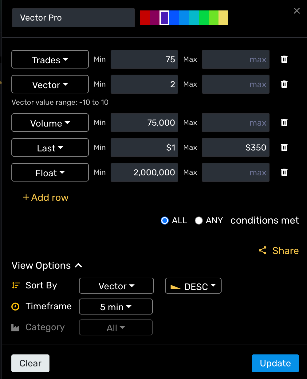 Once you have that settled, you can access Vector in Discovery (our analytics engine and screener). To do so, go to add a new filter and select the column and choose Vector.