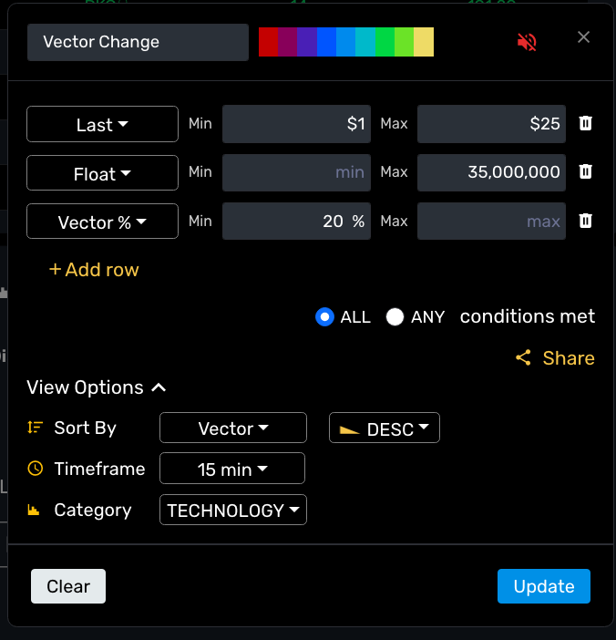 - Which stocks have a 20% MOMO Vector% change in the past 15 minutes?