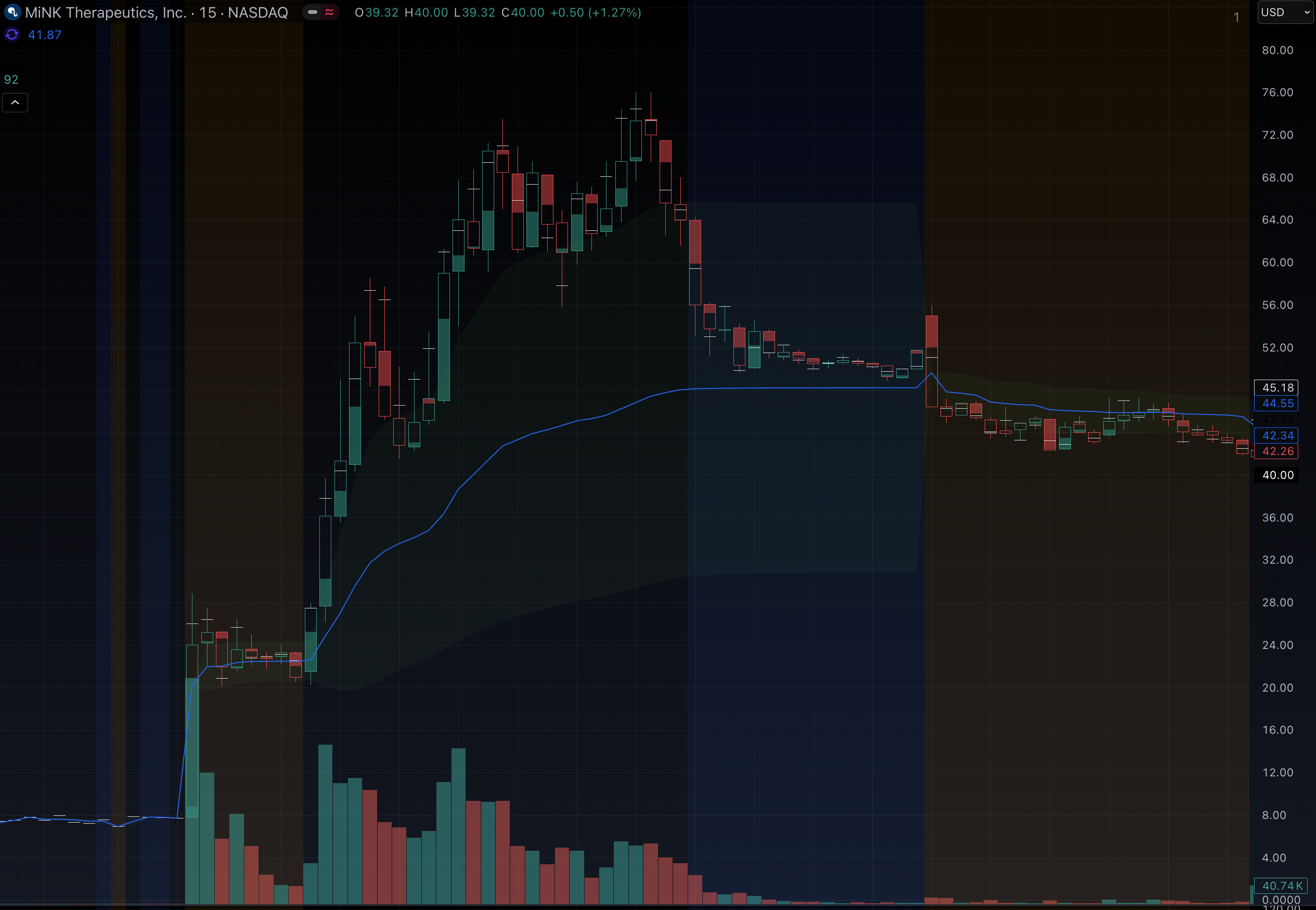 - A sharp reversal with red candles, including a halt down, dropping to ~$41.78 by close (bid $41.00, ask $41.78).