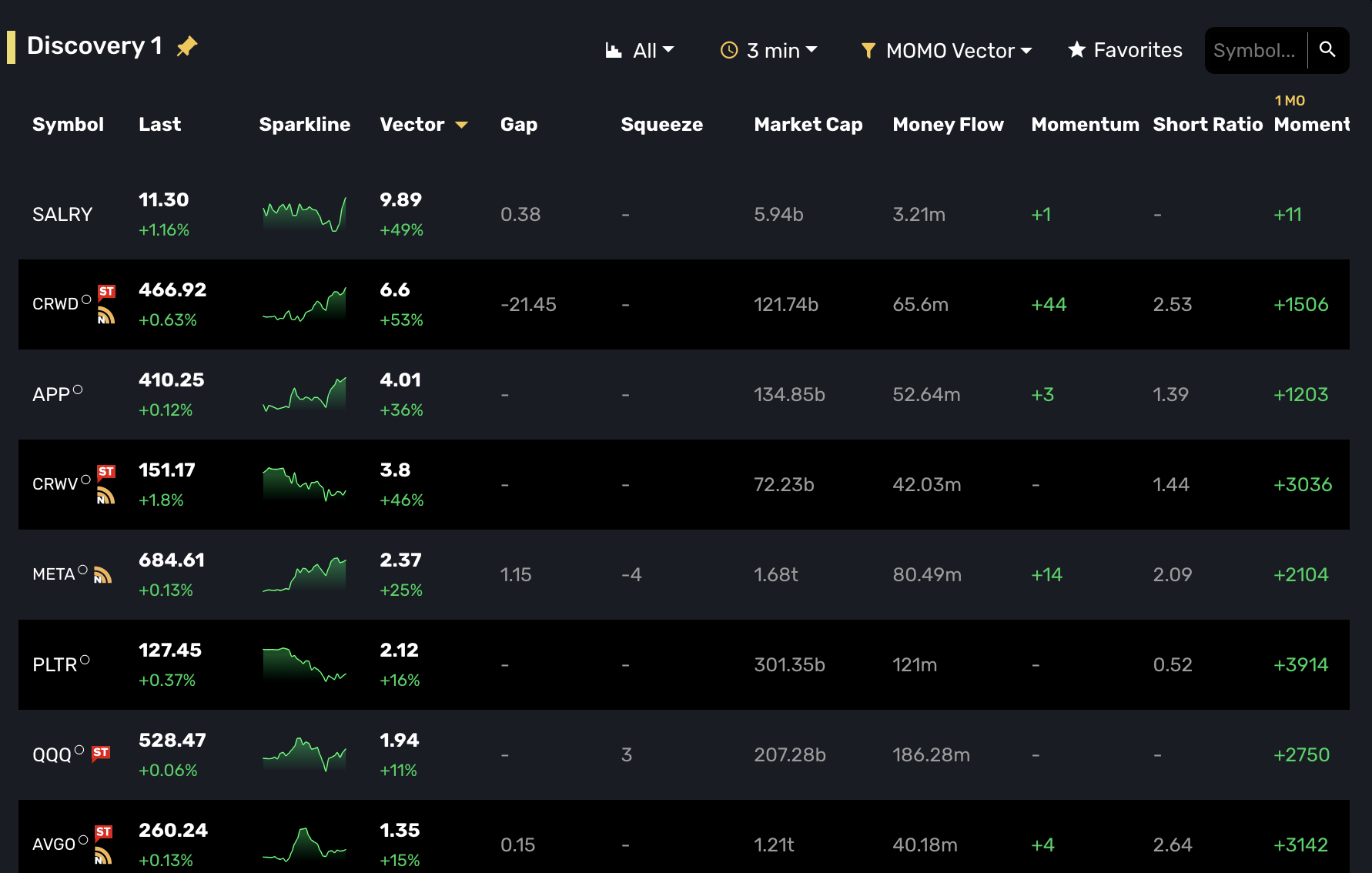 The 3-minute timeframe is something which smooths out "our" (MOMO Traders and myself) efforts to screen for validated moves while giving us a competitive edge over "our"competition (other traders) using static watchlists or platforms without this subtle, but powerful tweak.