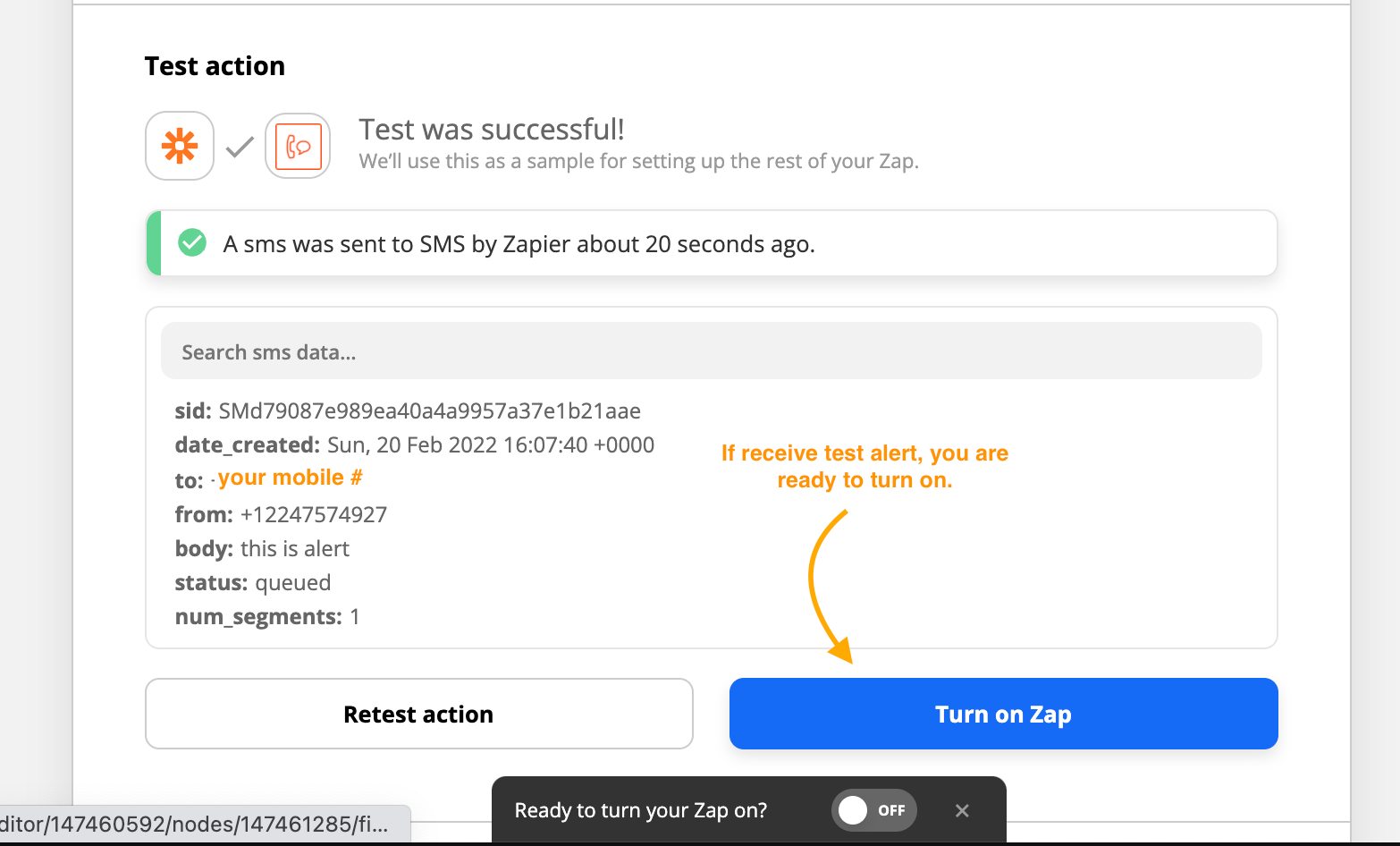 After pasting Zapier URL into MOMO, you next need to assign your SMS number in Zapier (below).