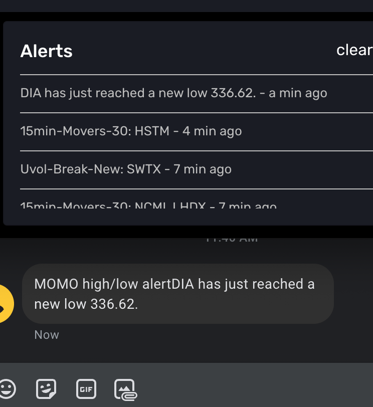 Update: This post was written while markets were closed and we are happy to report the alerts are instantaneous as advertised. Both the SMS and push notification were simultaneous as stated by Zapier. You can see our DIA alert showing now and took me a min of fumbling to get the screens aligned for a screenshot, hence MOMO alert window showing "a min ago".
