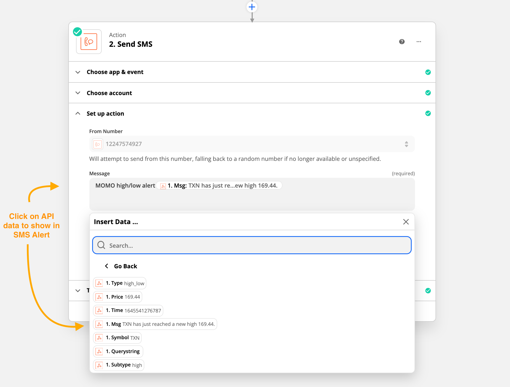 Next set up the action by passing through the information shared in the MOMO webhook event to what you want in the SMS payload. In most cases, the [Msg] field should suffice.