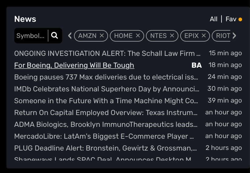 Drilling into the actual News component, you have options Search, select Recently clicked Symbols, or stream only items in Favorite list (Fav) or load stream for All news. Selecting any News item will load the available details for the News item.