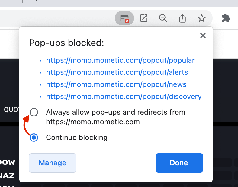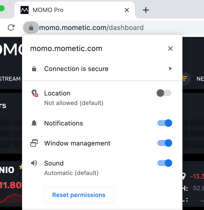 NOTE #2: To move pop-outs and save settings across 2 or more displays you need to enable window management. Enable this when prompted on the MOMO Dashboard. You can check this on your particular browser settings - should look similar to below (Chrome is shown).