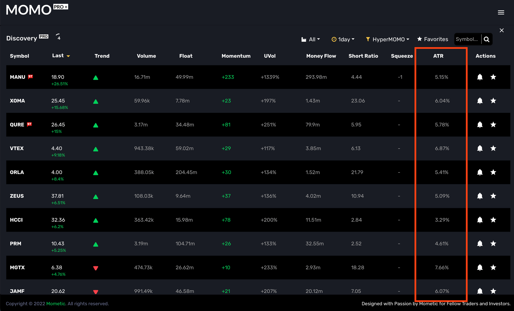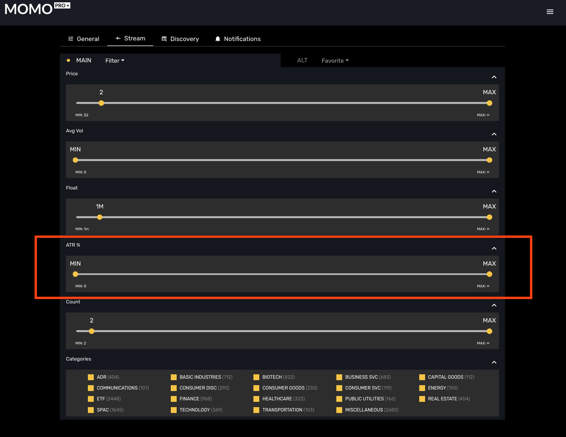 ATR is available to all MOMO Pro+ users and an available filter in Stream, Discovery as well as a Conditional notification. Add in ATR% as a filter or Condition to better uncover likely movers, but be weary of missing stocks when using too many filters.