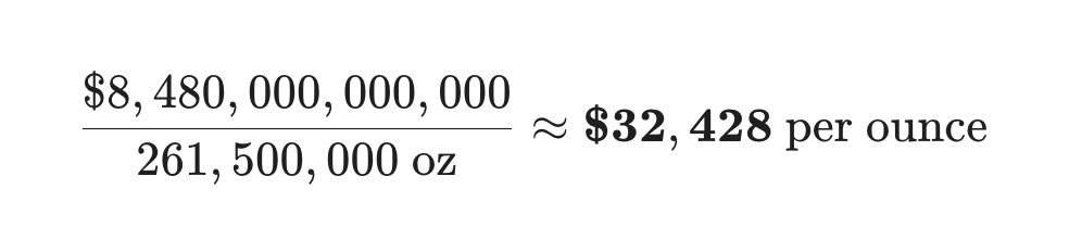 The $20k–$30k gold targets are derived by dividing a specific monetary supply (like M1 or M2 money supply) by the official U.S. gold reserves.