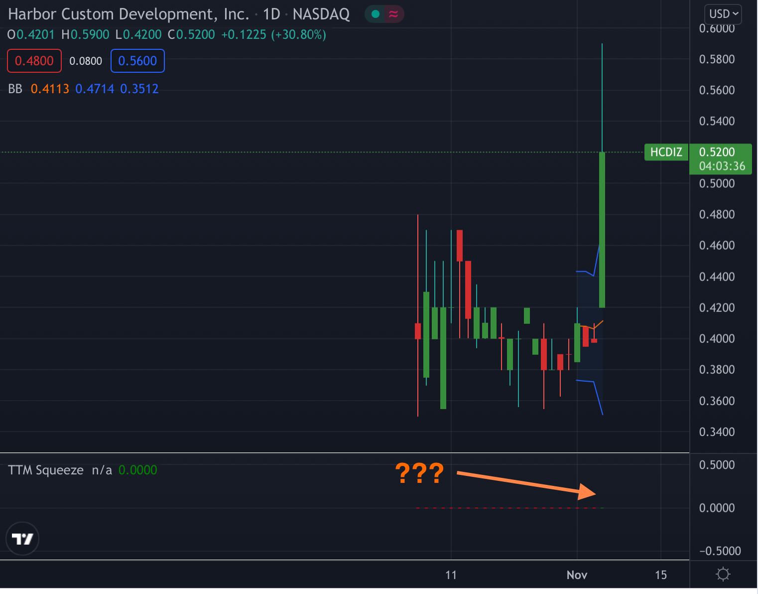 As you can see above HCDIZ is not being reported. This can partly be attributed to symbol being recently listed and variance in algo, but its clearly in a multi-day squeeze and are glad to see MOMO Squeeze shows this move.