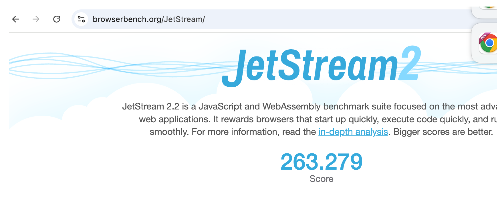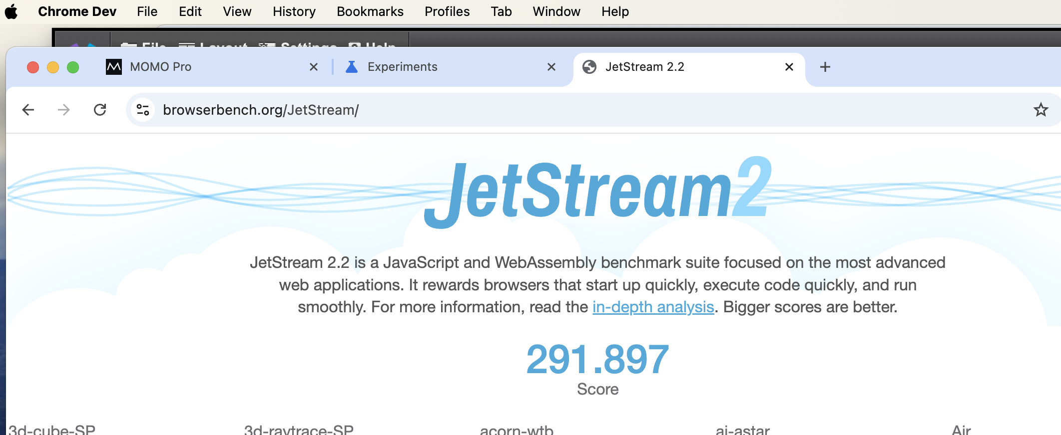 Here are the links to the test suites I used. Speedometer 3.0 measures the responsiveness of web applications, simulating real-world user interactions like adding to-do items or navigating a website. JetStream 2, on the other hand, focuses on the performance of JavaScript and WebAssembly, which are basis for advanced web apps including MOMO Pro.