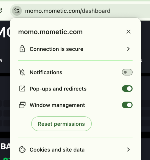 - Periodically delete cache & site data for momo.mometic.com. Click settings icon on left of URL and go to "Cookies and site data". After selecting navigate to delete momo.mometic.com data. (You will be required to log back in.)