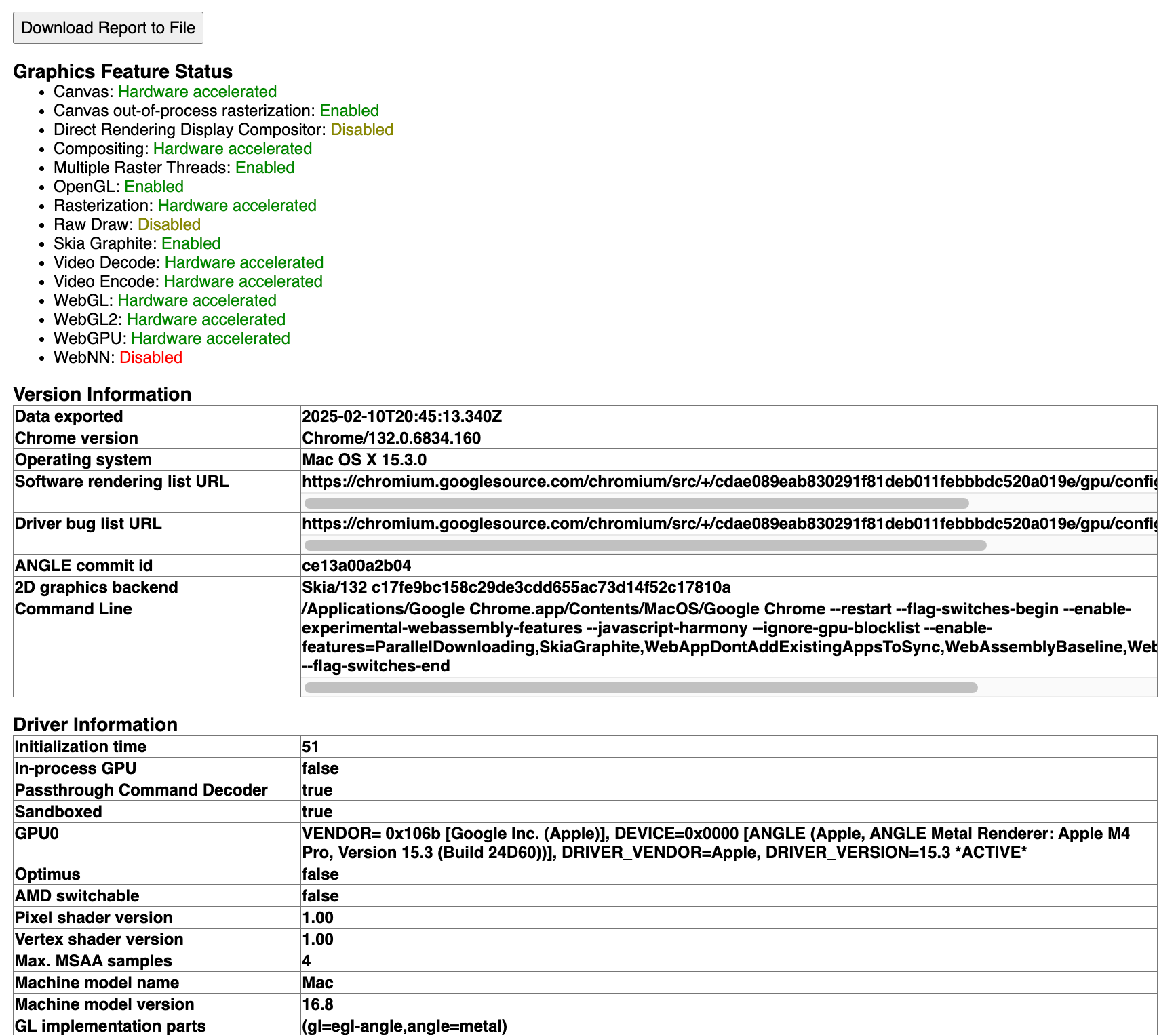 This command shows you all the current GPU settings chrome://gpu/ and will look something like what's shown below.