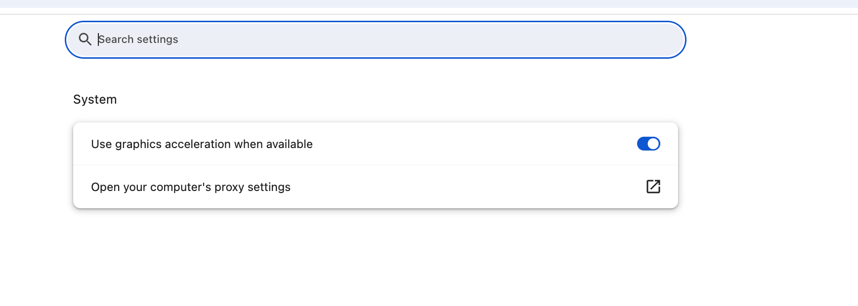 Check and verify hardware acceleration is enabled in chrome (enabled by default but worth checking). Go to Chrome's settings, navigate to the System section, and toggle the switch for this option.