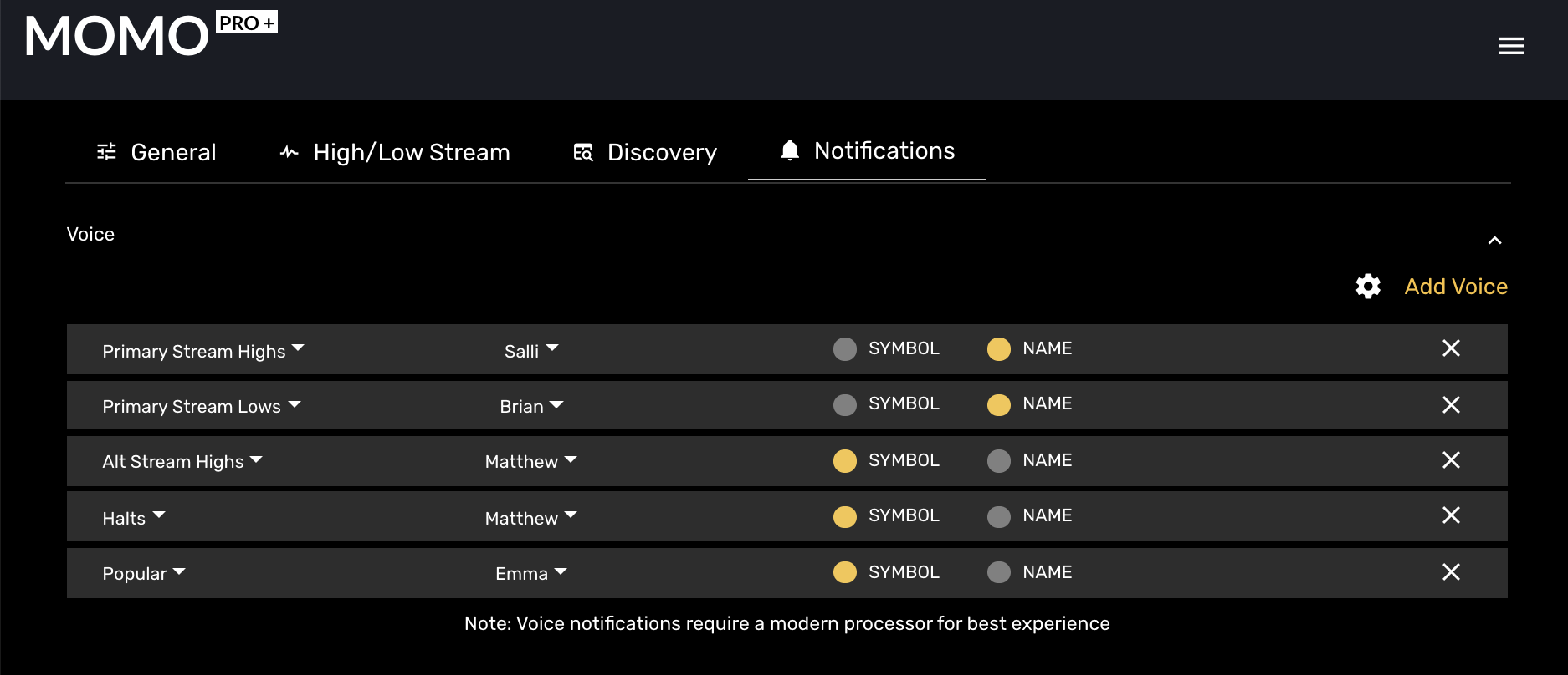 Neural Voice - Rather hear your scans audibly? Our voice notifications use AI generated voices to provide lifelike voices to your scans. Chose from 5 male and female voices and assign them to one or more scan. For example, assign the British female voice to new Stream highs and assign the American Male voice to new Stream lows. Read more...