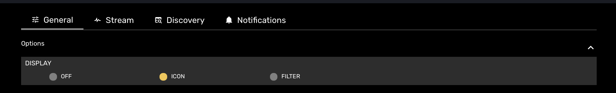 Settings include: OFF (do not filter or display icon), ICON (show degree symbol next to stocks with underylying options and Filter (only show stocks with Options in Stream and Discovery). Read more...