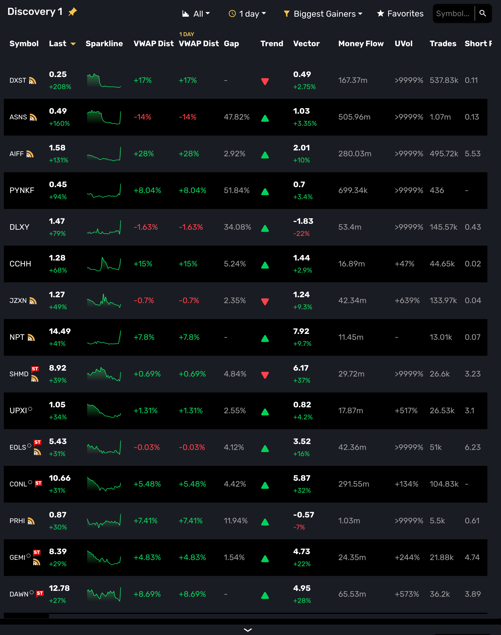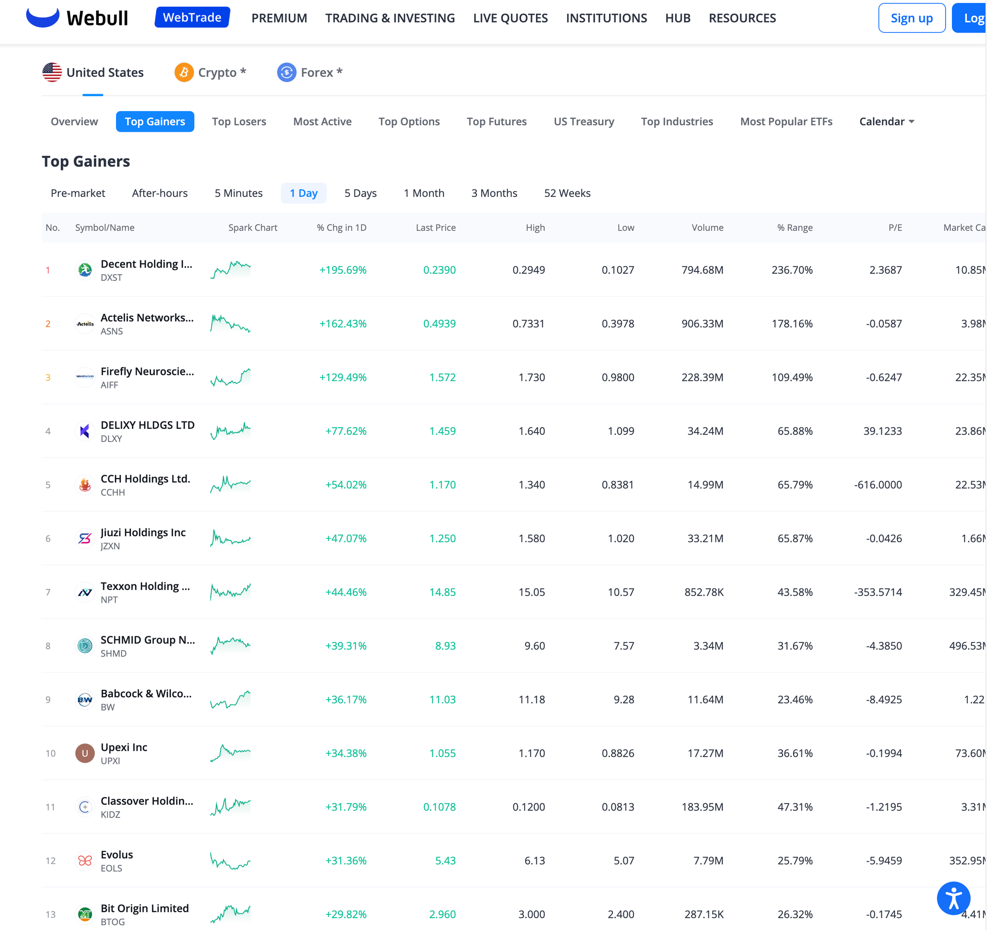 We have several traders also using Webull for their brokerage. For one reason or another they have mentioned that the Webull Top Gainers is useful. Scrolled through our sample screens and saw we have a "Biggest Gainers" and as you can see its providing essentially the same results when the timeframe is set to 1 day.