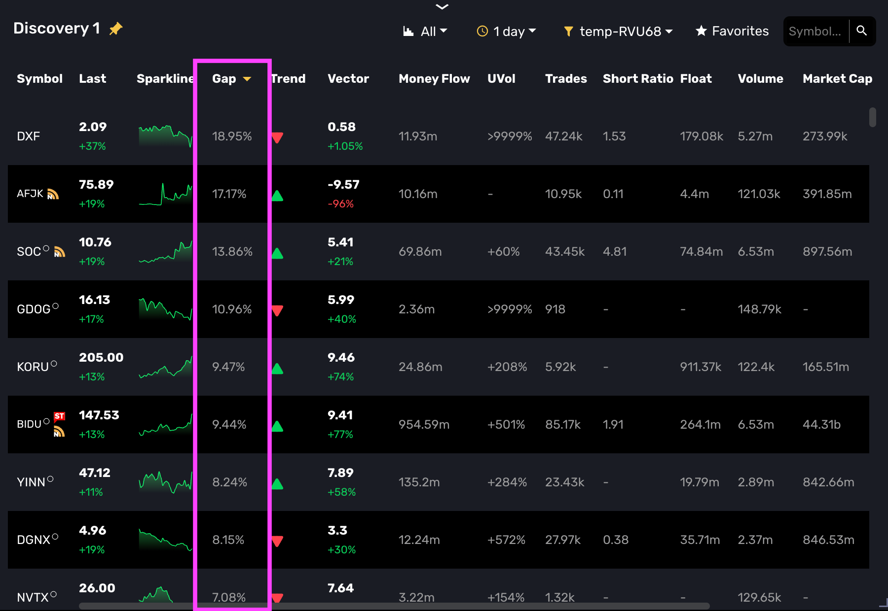 By sorting the "Gap" column in descending order (as seen above with symbols like DXF and AFJK), you can quickly isolate stocks with significant overnight enthusiasm. You are looking for high percentage gaps backed by unusual pre-market volume.