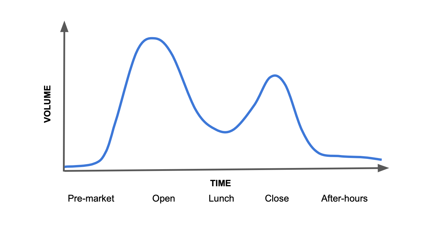 For the most part, stocks tend to follow a camel-like distribution curve throughout the day. Different time periods see different volume through course of day This makes sense. Lunchtime, Pre-market, and End of day all have unique market interest associated volume. And each stock has its own volume signature as well.